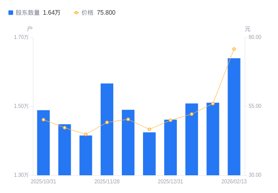 2月24日动静,数据显示,截至2026年2月13日,智立方A股股东总户数为1。64万户,较上期(2026年1月20日)添加1291户,增幅8。55%。此中畅通A股6055。28万股,户均持有畅通A股数量为3692。92股,较上期削减315。61股,降幅7。87%;户均持畅通A股市值27。99万元,较上期添加5。55万元,增幅24。72%。近一年(2025年2月20日至2026年2月13日),智立方A股股东户数从1。2万户,添加至1。64万户,增幅36。60%,区间股价上涨128。56%。