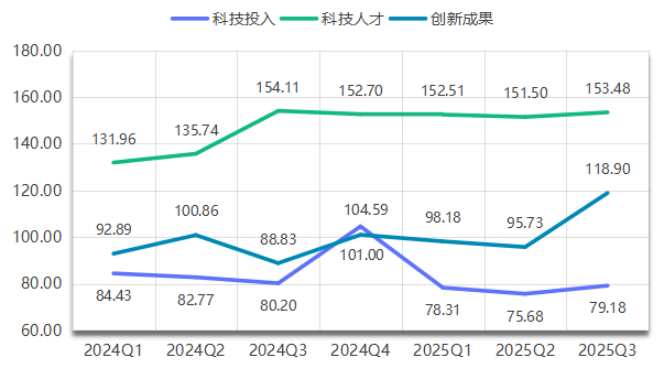 科技立异指数下设科技投入、智能制制、立异四项二级指数。2025年三季度,四项二级指数呈现“一平三增”走势,此中科技人才和科技投入指数别离为153。48点和79。18点,环比别离小幅增加1。31%和4。36%;立异指数强势昂首,指数值为118。90点,增速24。20%,较上年同期增加33。85%,是鞭策全体科技立异指数走强的焦点动力,次要缘由正在于三季度企业专利授权量较着添加,研发效率加速。