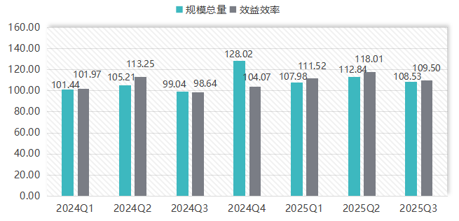 财产成长指数下设规模总量和效益效率两个指数,此中规模总量指数小幅下降,三季度指数值为108。53点,环比下降3。82%,较上年同期增加9。58%。效益效率指数高位回调,指数值为109。50点,环比下降7。21%,但较上年同期增加11。01%。