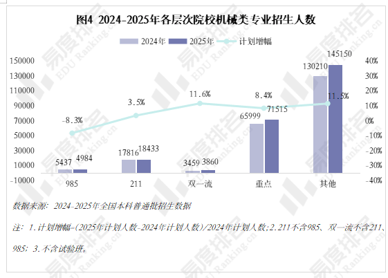 985院校机械类招生人数波动式下降,本年达到五年来最低,较2024年缩减8。3%,其他各条理院校则有3%-12%的涨幅,以更大的体量支持机械类招生总规模的抬升。