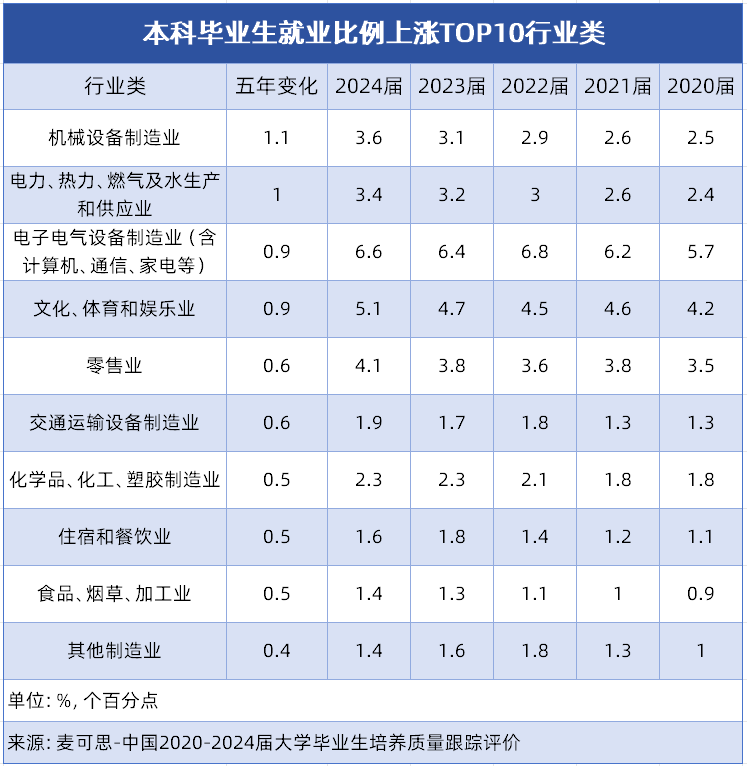 这10个行业类的分布特征明显:制制业相关行业占领从导,涵盖机械设备、占TOP10中的6席。这一态势表现了我国制制业转型升级成效,高端配备制制、电子消息等焦点范畴对专业本科人才需求兴旺。同时,能源保障、消费升级、平易近生办事等类行业的稳步增加,也为大师将来职业选择供给了更多元标的目的,这些增加显著行业对应的专业范畴,值得沉点关心。